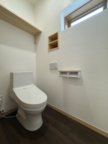 トイレの小便器は無くし、スペースを広くとりました。造作棚やニッチを設け、備品や小物を置く便利なスペースに。