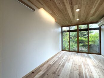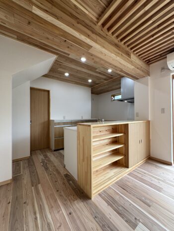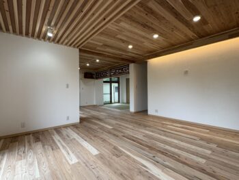 リビングは、天井と床に屋久島の杉「ヤクイタ」を張りました。ヤクイタの心地よい香りが、室内に広がります。