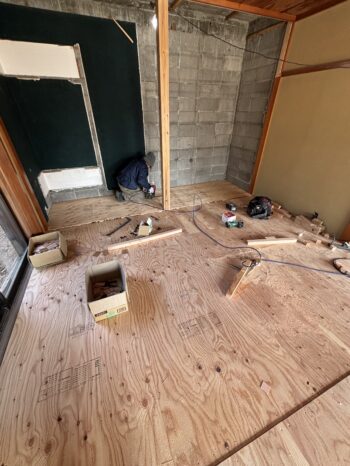 解体後、床の下地材を張っていきます。